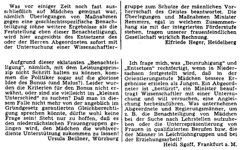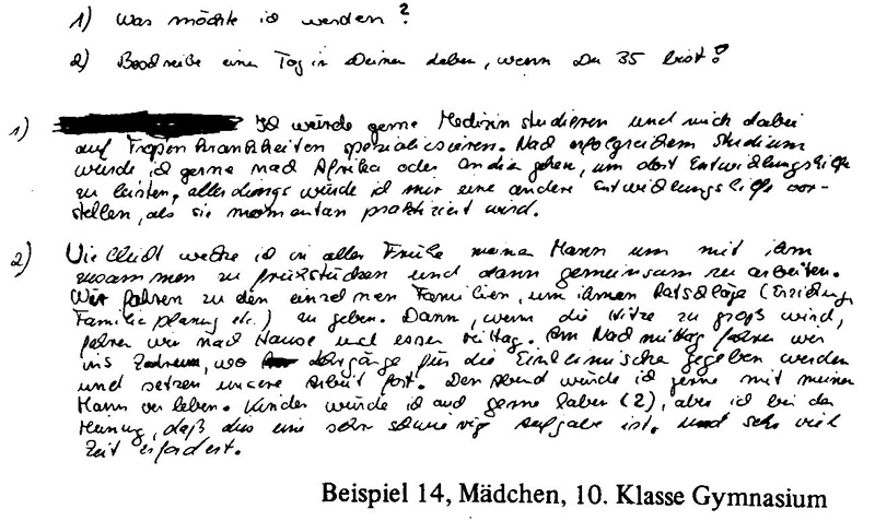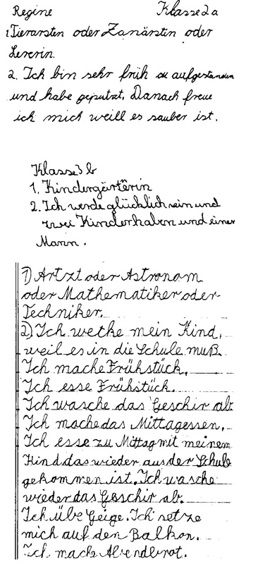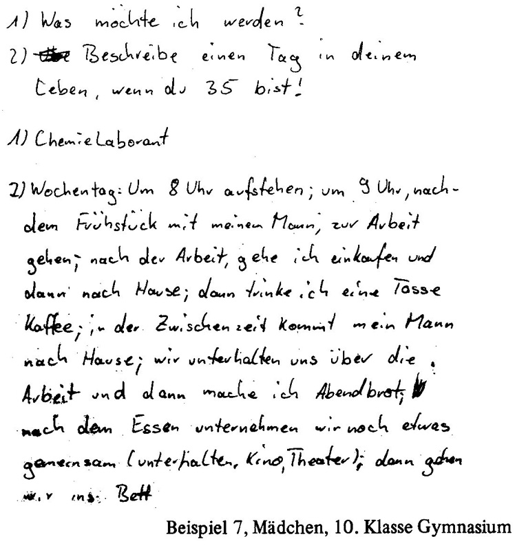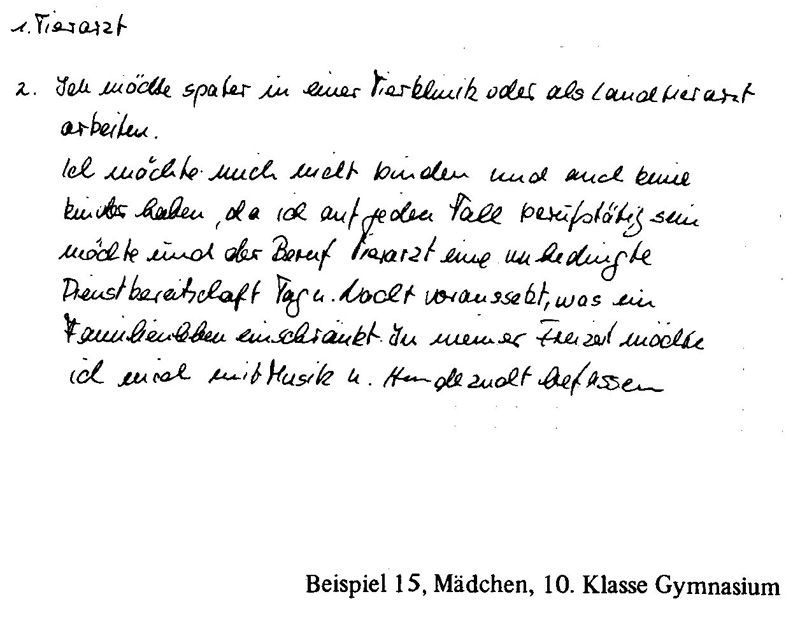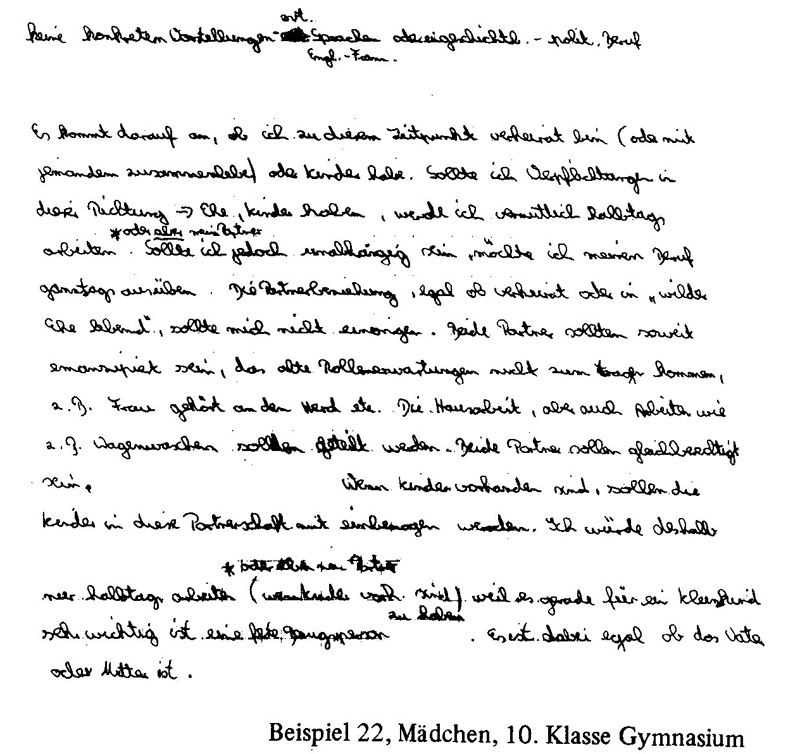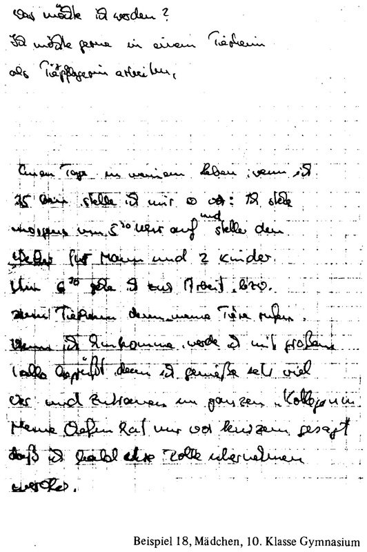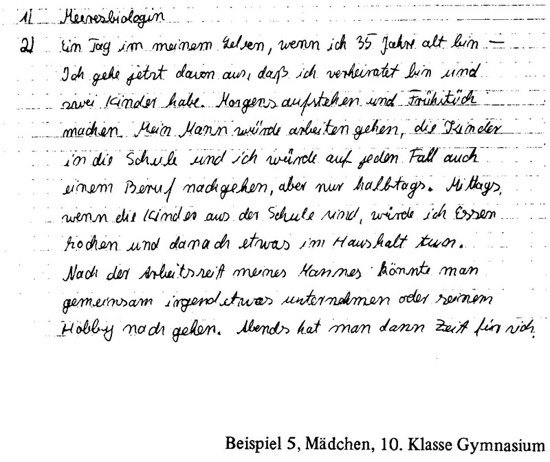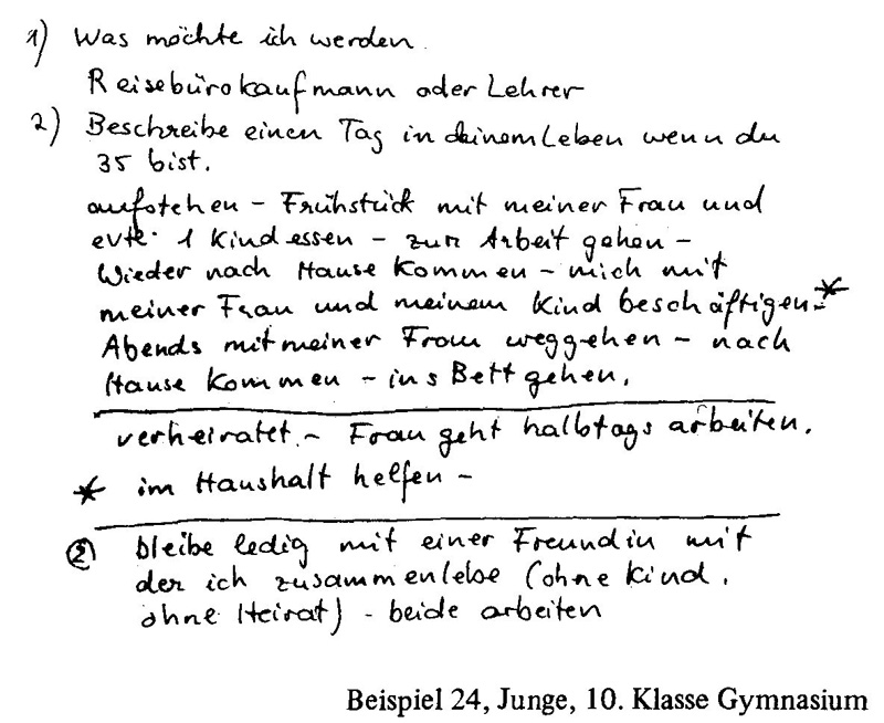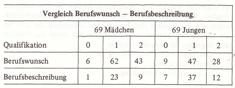 Im Rahmen dieser Arbeit habe ich eine empirische Untersuchung über die Zukunftspläne und Vorstellungen von Mädchen und Jungen durchgeführt. Darüberhinaus wertete ich Fragebögen aus, die die Lehrerinnen in ihrem Unterricht verwendet hatten. Ich werde die Ergebnisse im Zusammenhang mit einigen ähnlichen Untersuchungen vorstellen. Vorstellungen geschlechtsspezifischer Eigenschaften und Funktionen von Jugendlichen haben sich bisher wenig geändert, wenn wir nach ihren Äußerungen zu dem Themenkomplex gehen.