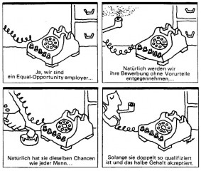 Wie auch bei uns, sind Frauen in den USA meist nur in niedrigen akademischen Positionen und in bestimmten Fachbereichen zu finden. In der Diskussion dieser Tatsache kamen die subtileren Formen der Diskriminierung zum Ausdruck, die berufliche Qualifikation und Aufstiegschancen blockieren, kollegiale Kontakte und gesellschaftlicher Zugang zu Verlagsdirektoren und Herausgebern von Zeitschriften, die gewöhnlich männlich sind. (Wie in der Geschäftswelt werden auch auf dem akademischen Markt Aufträge für Bücher oder Aufsätze oder der Vorsitz bei einer Konferenz oft am Biertisch oder bei einer Cocktailparty ausgehandelt.)[8] Es stellte sich heraus, daß Universitäten Frauen bei gleicher Qualifikation und gleicher Arbeit niedrigere Gehälter zahlten.[7]