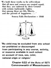 »Zum Gericht zu gehen hat bei der Durchsetzung der Gesetze geholfen und hat gleichzeitig die gesetzlichen Maßnahmen klarer gemacht und näher bestimmt. Frauenorganisationen wie der National Organisation of Women (NOW), Defense Fund, die Women's Equity Action League (WEAL) und verschiedene Lehrerorganisationen haben Gerichtsfälle erfolgreich durchgezogen, auf dem Gebiet der Frauenrechte im allgemeinen und in pädagogischen Fragen im besonderen. Die National Education Association hat z.B. über drei Millionen Dollar für diese Arbeit in den letzten Jahren ausgegeben.«[52]