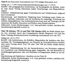 Es gibt inzwischen eine Reihe von Staaten, die ähnliche Gesetze gegen geschlechtsspezifische Diskriminierung im Ausbildungswesen verabschiedet haben (Kalifornien, Illinois, Massachusetts, Texas, Minnesota, Washington, Pennsylvania, New Jersey). Diese Gesetze beziehen sich entweder nur auf die Inhalte von Schulbüchern (z.B. in Kalifornien) oder sie betreffen eine Reihe von Bereichen: Zugang zu Ausbildungsprogrammen (wichtig z.B. in Sport und in Fachschulen), Berufsberatung, Curriculum und Lehrmittel, außerschulische Aktivitäten sowie Räumlichkeiten und Ausstattung (z.B. in Massachusetts). Andere haben Erklärungen abgegeben, die aber nicht binden sind (z.B. New York). (Auszüge der Richtlinien der Gesetze von Kalifornien und Massachusetts sind im Anhang abgedruckt.) Diese Gesetze kamen auf Druck der Frauenbewegung zustande. Frauenverlage und Frauenorganisationen trafen sich mit Regierungsvertretern, um ihnen Gesetzesentwürfe für Lehrpläne, Schulbücher etc. zu unterbreiten.