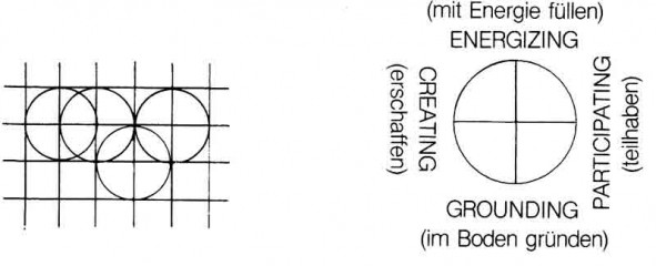 Die feministische Theologie legt den Nachdruck auf Gott als eine dynamische Wirklichkeit. Das ist einer der Gründe, warum Mary Daly den Vorschlag macht, Gott nicht mehr mit einem selbständigen Dingwort, sondern mit einem Tätigkeitswort zu bezeichnen: Sein, Seiendes, Being, Sein-Werden. Sheila Collins[12] erzählt von einer Grailville-Konferenz von 1972, wo die Teilnehmer Gott als Knotenpunkt statt als autoritäre Spitze aller Wirklichkeit dargestellt haben. Ein zweites Bild verglich Gott mit einem Elektrizitätswerk, »the grid of being«, der Energiequelle alles Seins; die Gemeinschaft wirkt dann als erdender Grund. Die Vorstellung wurde in einem Diagramm dargestellt, in dem viele Kreise vorkommen: jeder Kreis bringt Vollkommenheit und die schöpferische Spannung von Gegensätzen zum Ausdruck. Der Kreis repräsentiert sowohl individuelle menschliche Wesen wie Gott: